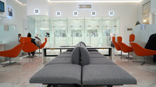 Одно из моих любимых мест в отделении — ресепшн. Там можно видеть всех клиентов, которые заходят к нам и встречать их с улыбкой. Это популярное место среди сотрудников, а рядом стоят платежные терминалы, цифровая информационная панель, планшет с функцией ID TOUCH.